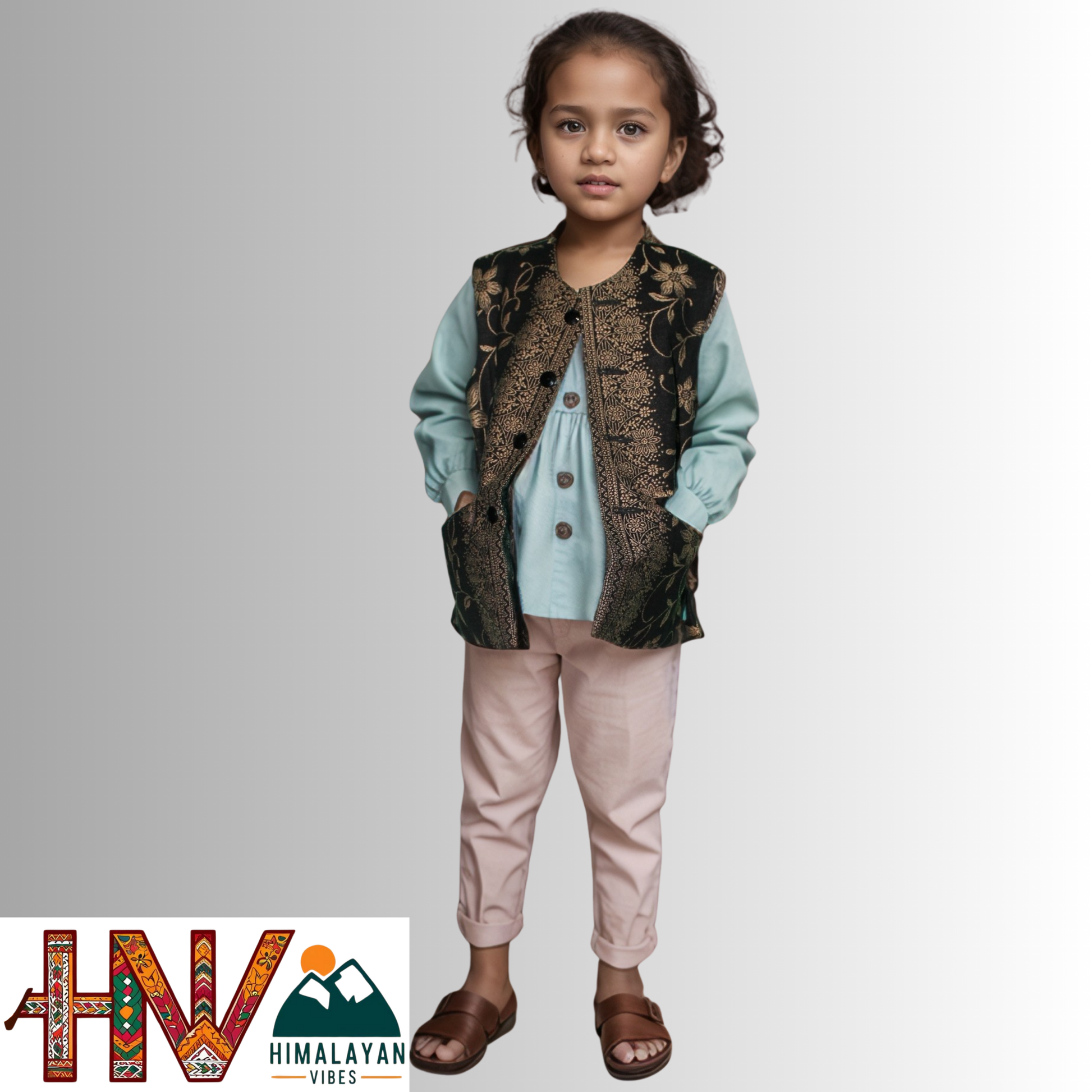 Kids Shawl Black Color Himachali Sadri with Flower pattern – Traditional Waistcoat by Himalayan Vibes (Size)