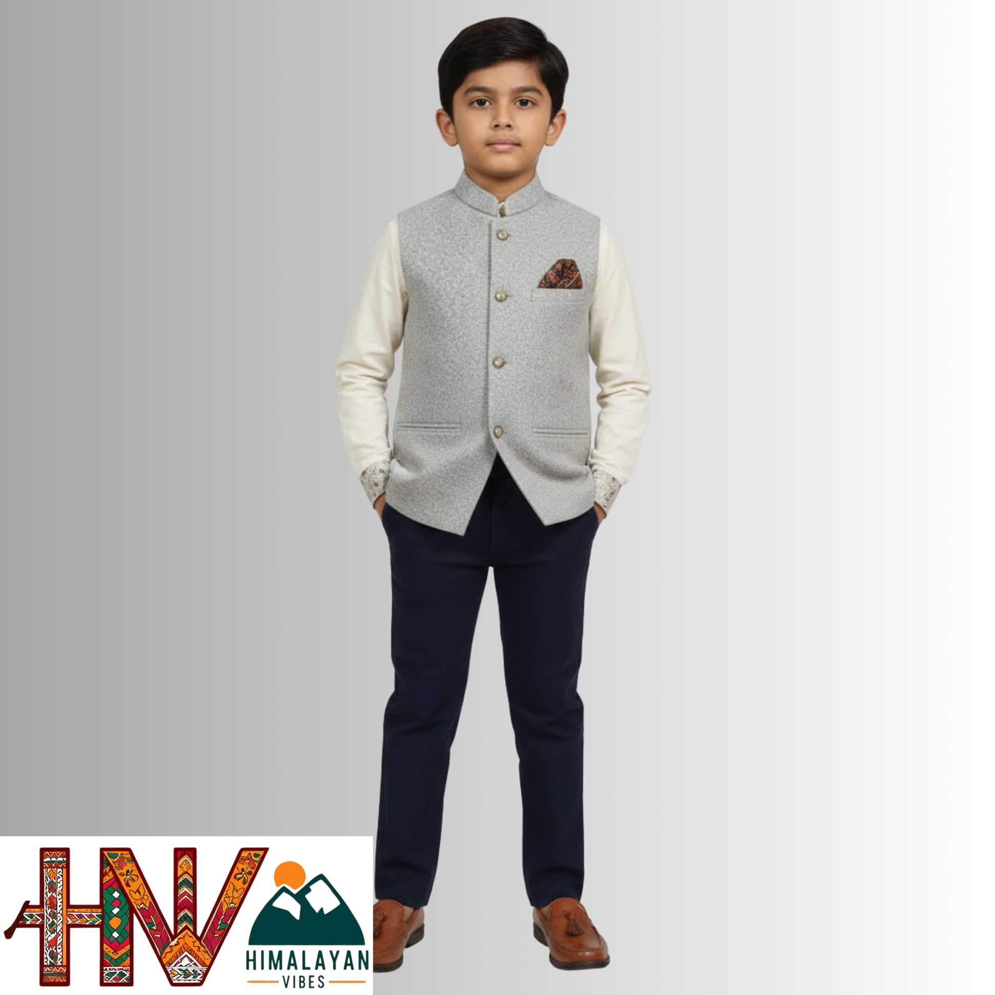 Boys Sleeveless Light Grey Nehru Jacket in Martin Fabric – Handcrafted Himachali Ethnic Waistcoat with Designer Pocket Square