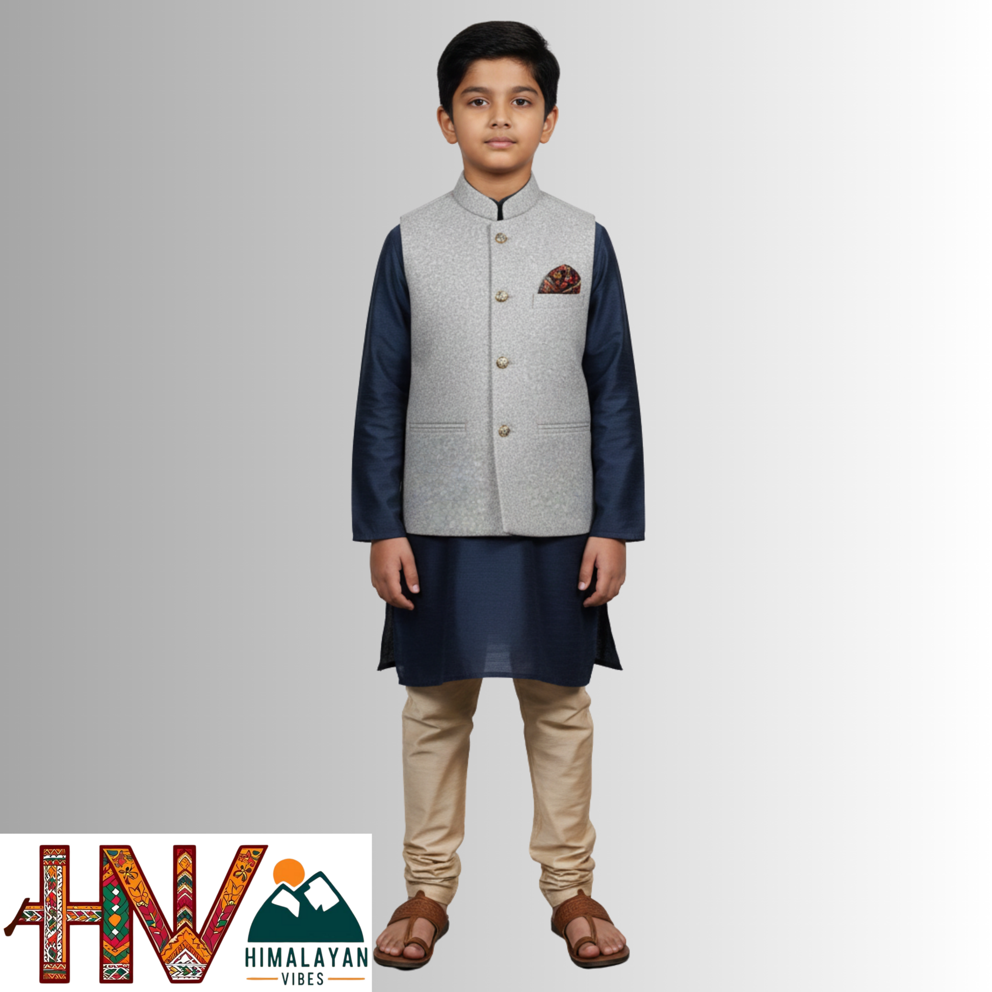 Dress your little one in timeless style with this handcrafted sleeveless jacket for boys, made from premium Martin fabric by skilled artisans of Himachal Pradesh. Designed with a smart Mandarin collar and traditional detailing, this jacket blends classic charm with a modern silhouette — perfect for festive events, weddings, and school functions. The sleeveless design ensures comfort and easy layering, while the fine craftsmanship reflects the richness of Himachali heritage. A stylish choice that brings grace and confidence to your child’s ethnic look.