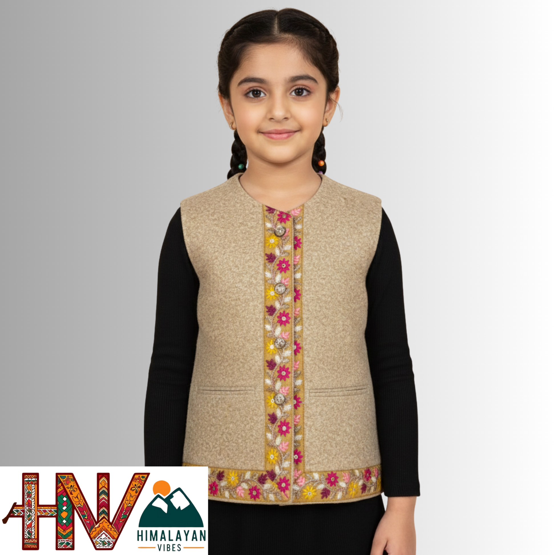 Let your child embrace the charm of the hills with this beautifully crafted Himachali Sadri jacket for girls. Made from premium Martin fabric, this sleeveless jacket blends traditional craftsmanship with modern-day comfort — perfect for festive occasions and cultural events. Adorned with a delicate handcrafted lace border, it brings a regal flair to your little one's ethnic look. Designed by skilled Himachali artisans, it’s a warm and elegant choice for weddings, school functions, or family celebrations.