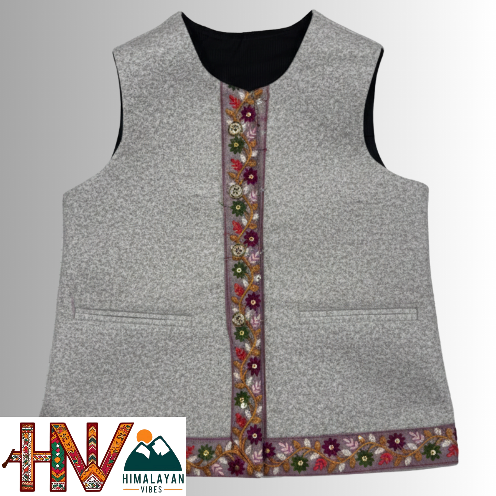 Girls Sleeveless Light Grey Woolen Sadri Jacket in Martin Fabric – Himachali Handcrafted Ethnic Wear with Floral Embroidery