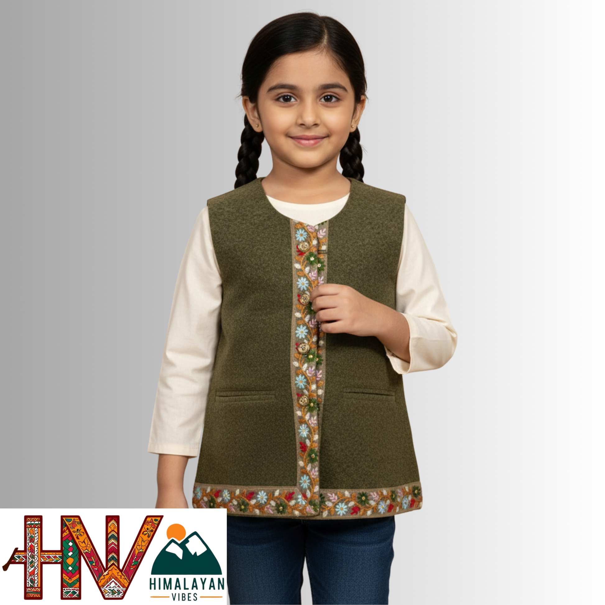 Let your child embrace the charm of the hills with this beautifully crafted Himachali Sadri jacket for girls. Made from premium Martin fabric, this sleeveless jacket blends traditional craftsmanship with modern-day comfort — perfect for festive occasions and cultural events. Adorned with a delicate handcrafted lace border, it brings a regal flair to your little one's ethnic look. Designed by skilled Himachali artisans, it’s a warm and elegant choice for weddings, school functions, or family celebrations.