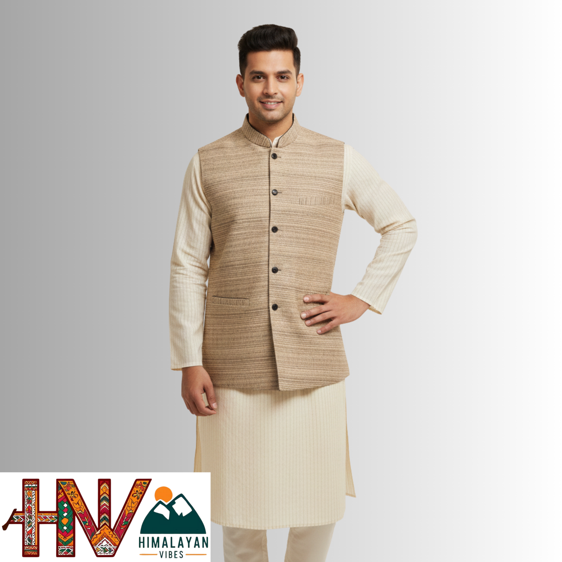 Handcrafted Himalayan Vibes Natural Beige Woolen Nehru Jacket for Men | Traditional Himachali Craft | Stylish Winter & Formal Wear