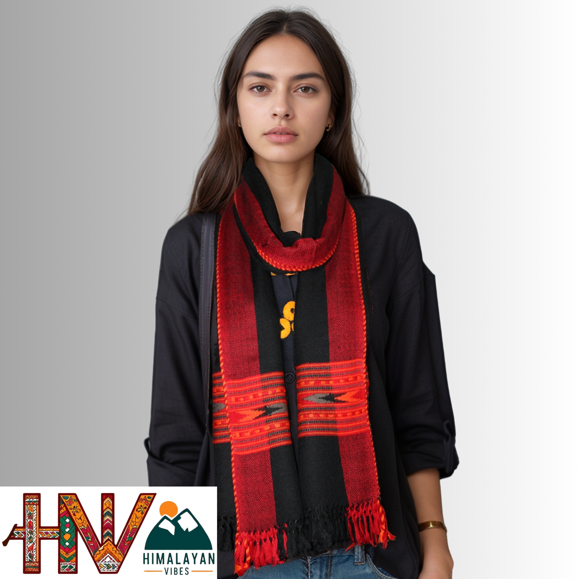 Handwoven Black Kullu Woolen Stole with Traditional Kullu Patti Design in Vibrant Red Border– Handwoven Elegance By Himalayan Vibes