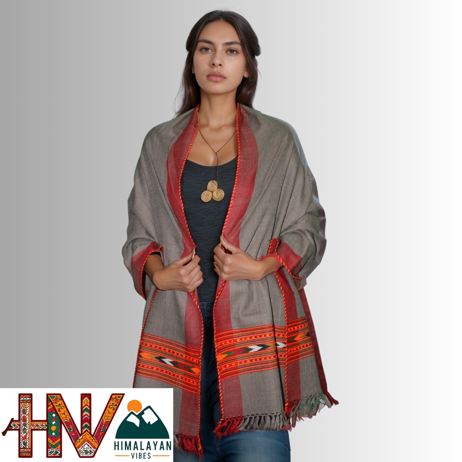 Handwoven Grey Kullu Woolen Stole with Traditional Kullu Patti Design with Red Border– Handwoven Elegance By Himalayan Vibes