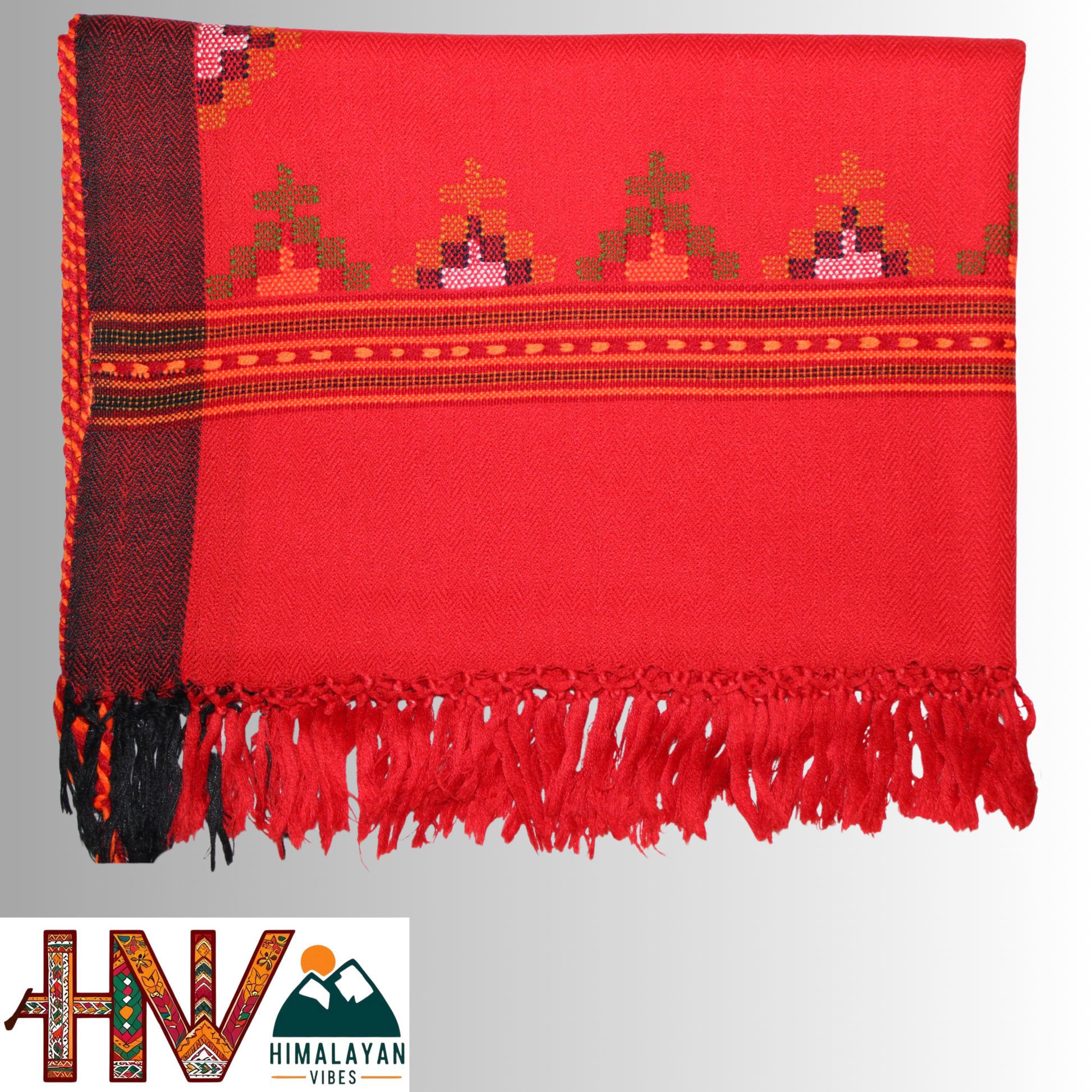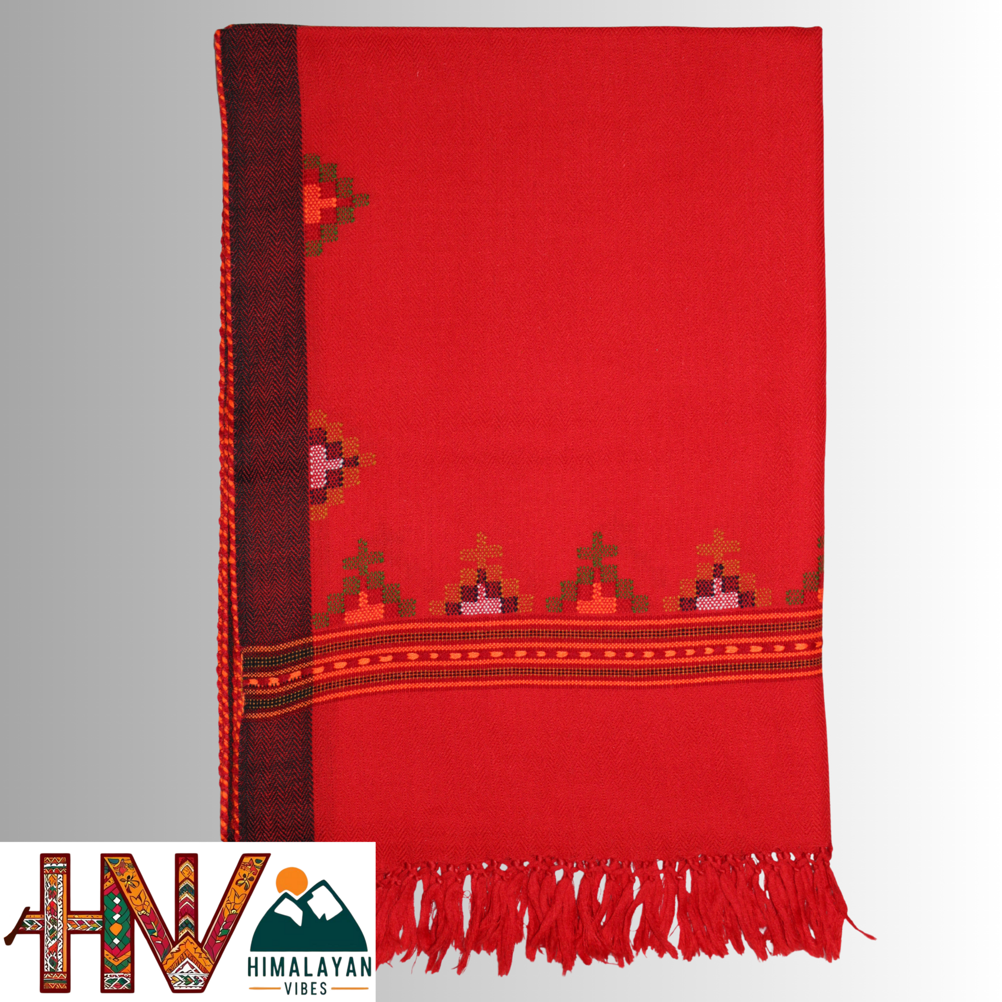 Handwoven Red Kullu Woolen Stole with Traditional Kullu Patti Geometric Motifs with black Border– Handwoven Elegance By Himalayan Vibes