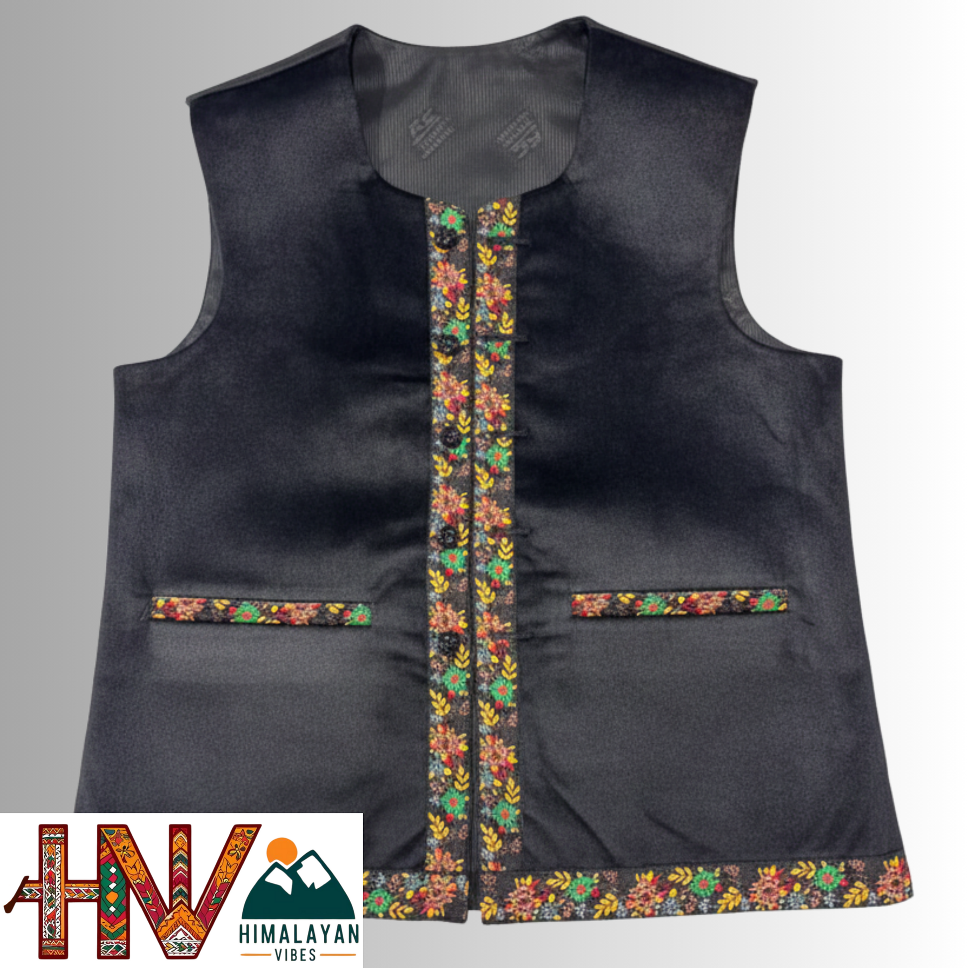 Himachali Black Sadri with embroidered Lace for Women - Martin Fabric Ethnic Half Jacket with Pockets