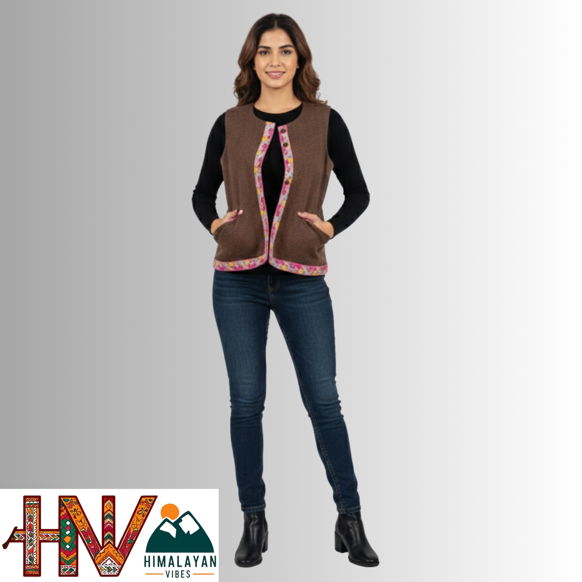 Himachali coffee brown Sadri with embroidered Lace for Women - Martin Fabric Ethnic Half Jacket with Pockets