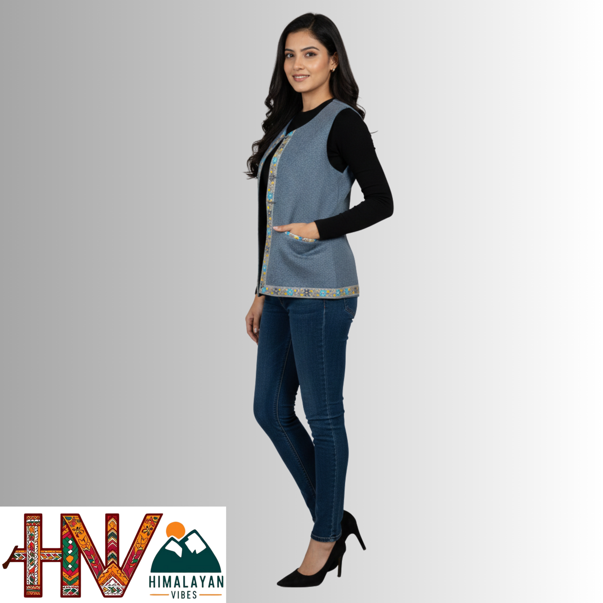 Himachali Light Blue Sadri with embroidered Lace for Women - Martin Fabric Ethnic Half Jacket with Pockets