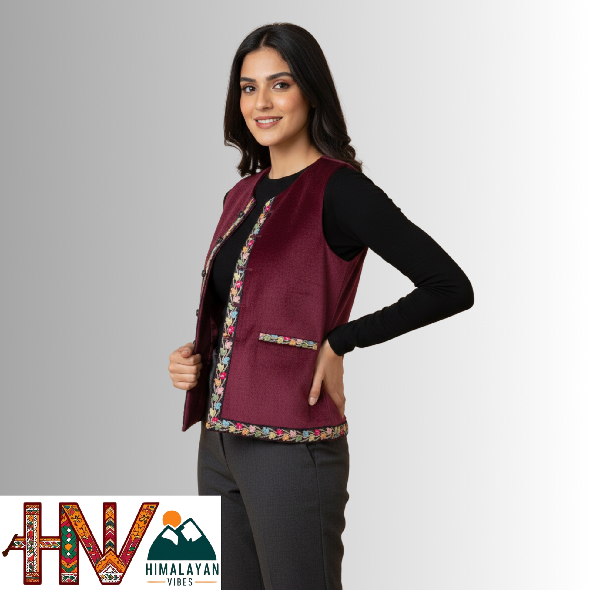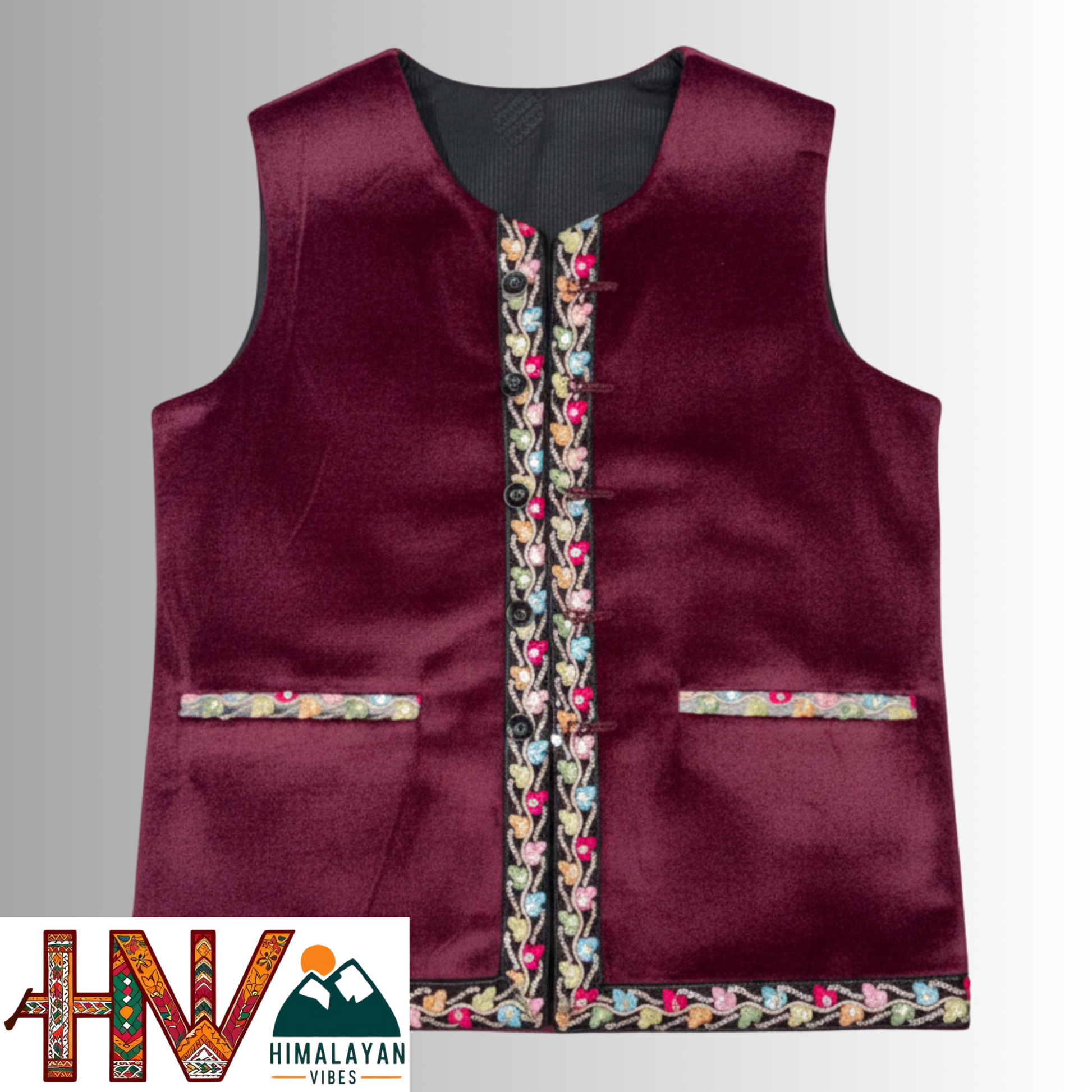 Himachali Maroon Sadri with embroidered Lace for Women - Martin Fabric Ethnic Half Jacket with Pockets