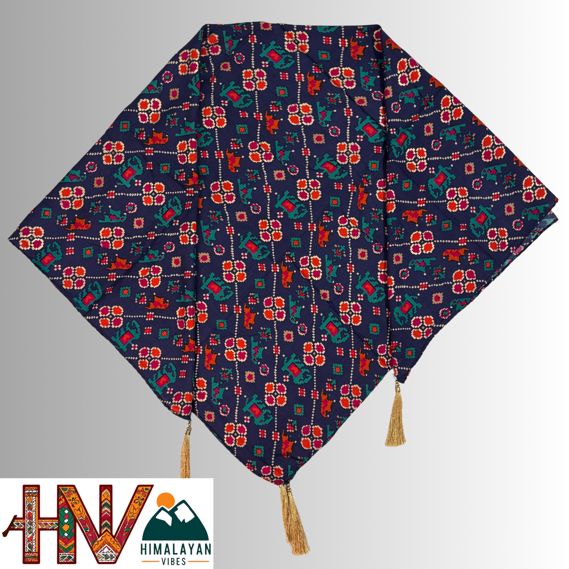 Himalayan Vibes Navy Blue Color Himachali Dhatu with Multicolor Print - Handcrafted Traditional Head Scarf from Himalayas