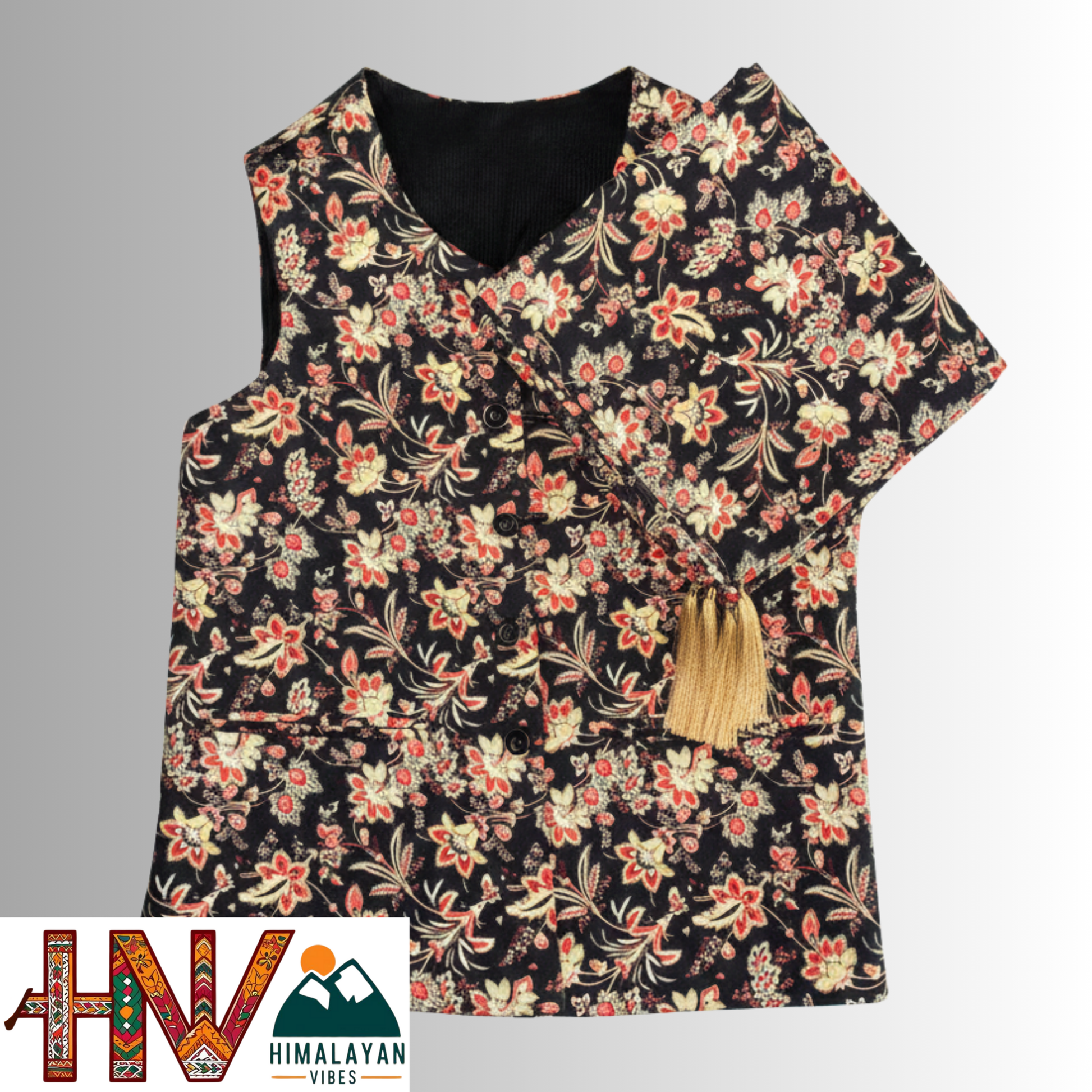 Himalayan Vibes Women's Pashmina Mix Sleeveless Sadri - Black & Red Floral Print (Size)