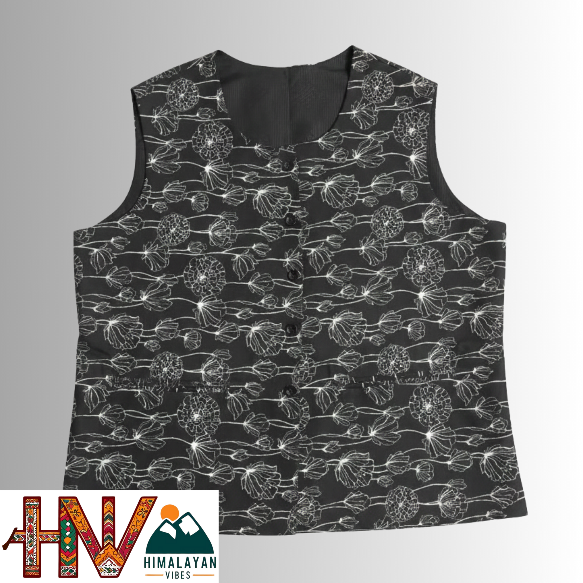 Himalayan Vibes Women's Pashmina Mix Sadri - Black & White Floral Print