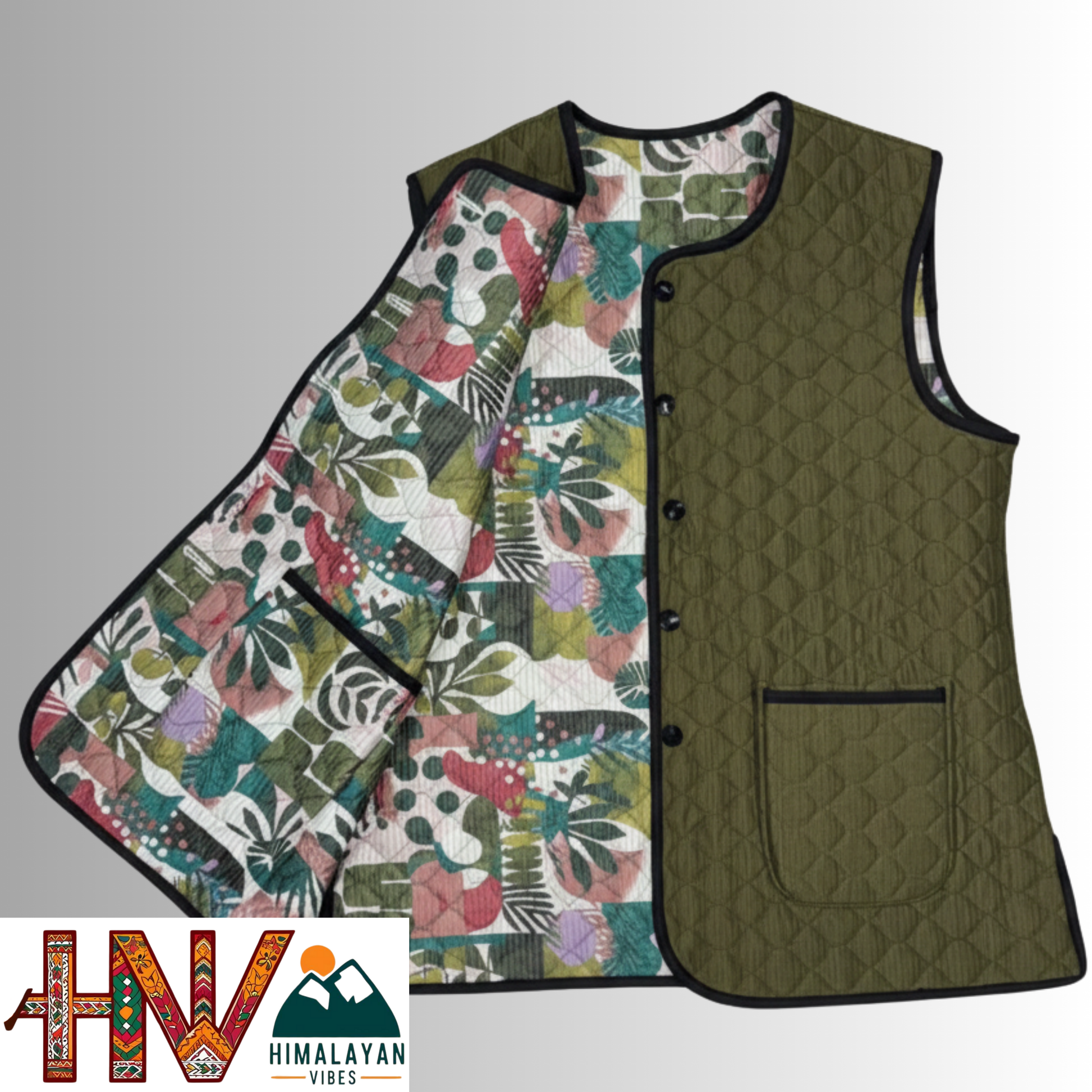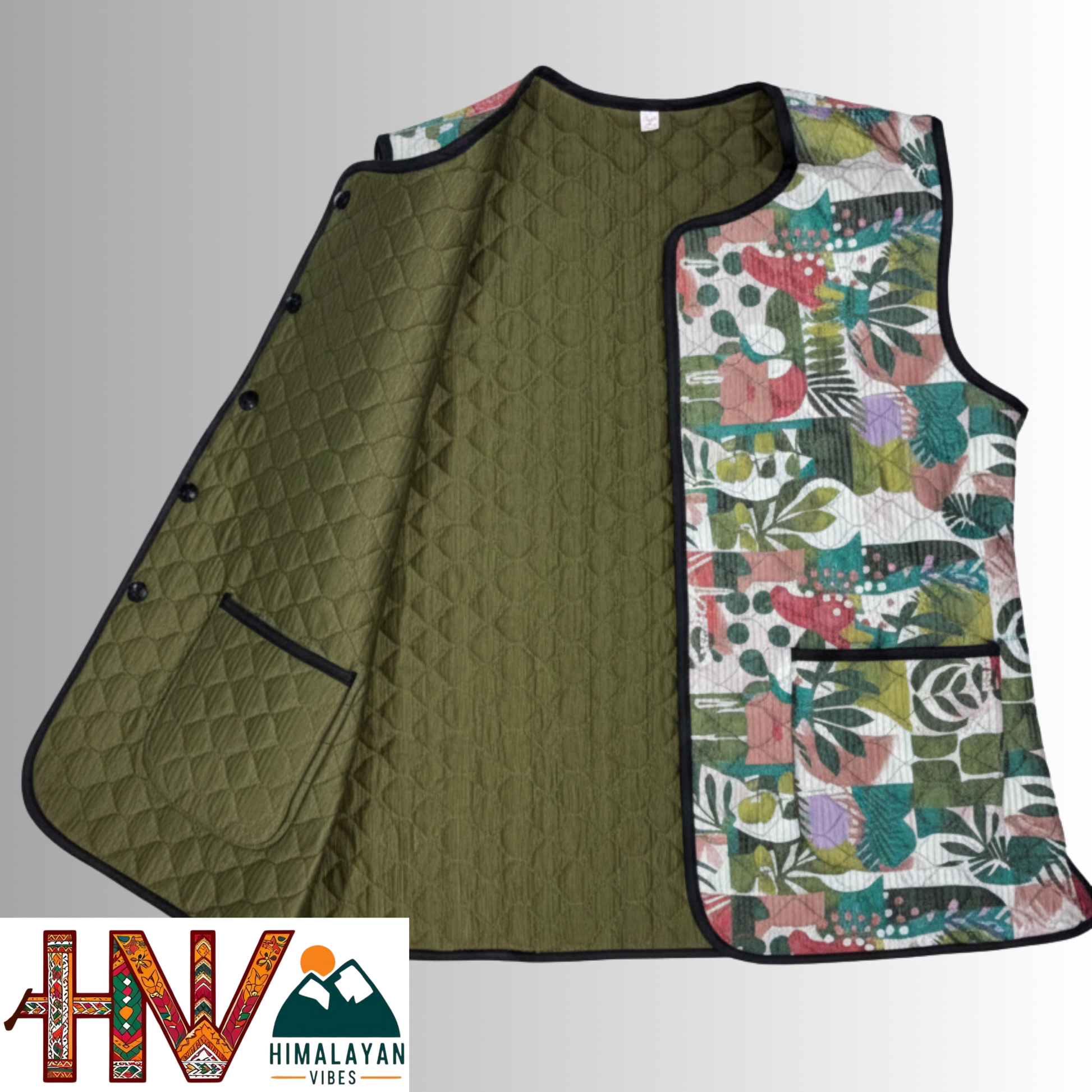 Reversible Olive Green & Botanical Multicolor Sadri for Women – Dual Look Ethnic Waistcoat | Floral & Solid Textured Design by Himalayan Vibes