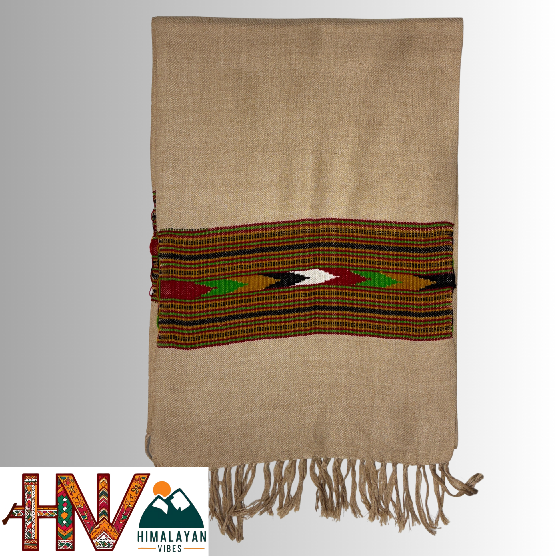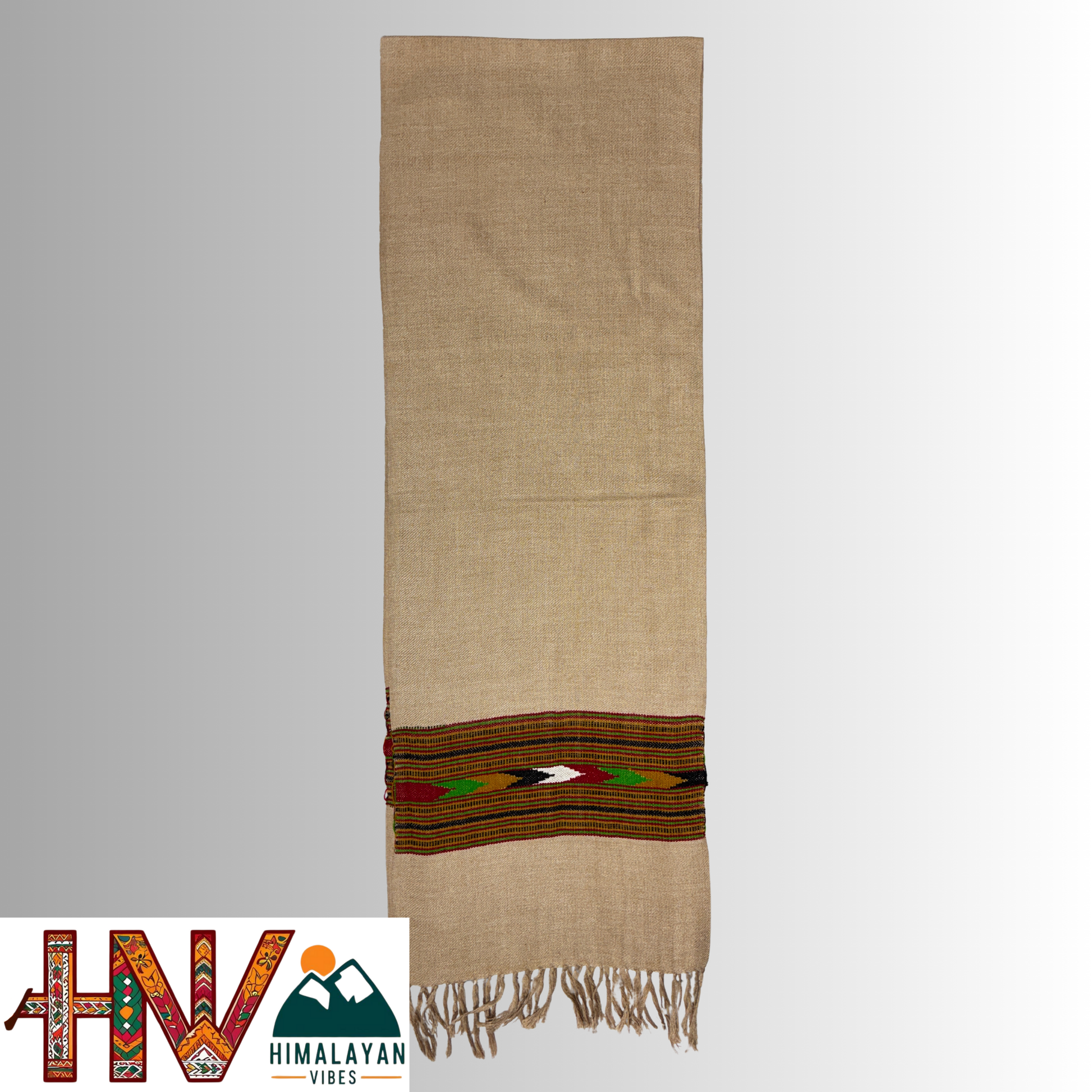 Traditional Kullu Patti Design Wool Muffler | Fawn Handloom Scarf with Earthy Geometric Strip By Himalayan Vibes