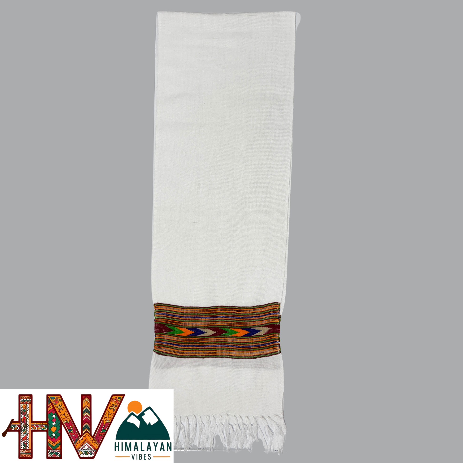 Traditional Kullu Patti Design Wool Muffler | White Handloom Scarf with Vibrant Geometric Strip By Himalayan Vibes