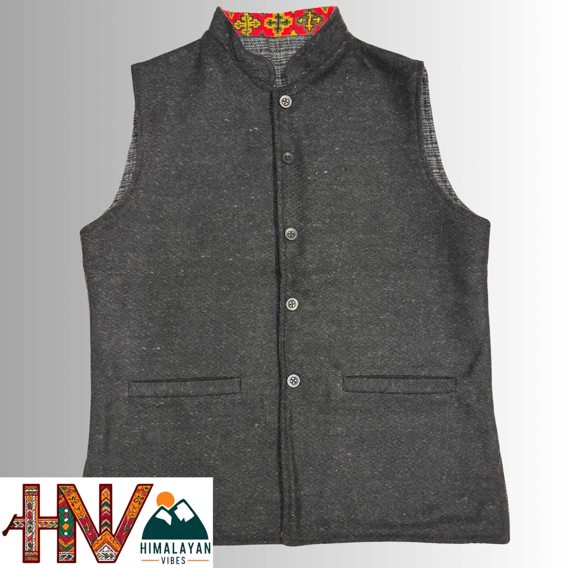 Crafted in the heart of the Kullu Valley, this woolen Sadri showcases the finest in traditional and contemporary design. Woven from high-quality wool by local artisans, it offers warmth, comfort and rich heritage. The slim-fit silhouette flatters your figure while the sleeveless design and full button placket with mandarin collar provide timeless yet fresh appeal. Functional pockets—two outer and two inner—add convenience, and the smooth inner lining ensures a polished fit and comfortable layer. Whether you’re attending a festive gathering, a winter celebration or embracing ethnic style with a modern twist, this Sadri delivers warmth, craftsmanship and style in equal measure. Plus, with its reversible design, you get two looks in one—truly making it a standout piece of wearable art. Choose the jacket where regional artistry meets fashion-forward thinking, and wear a piece of Kullu tradition with pride.