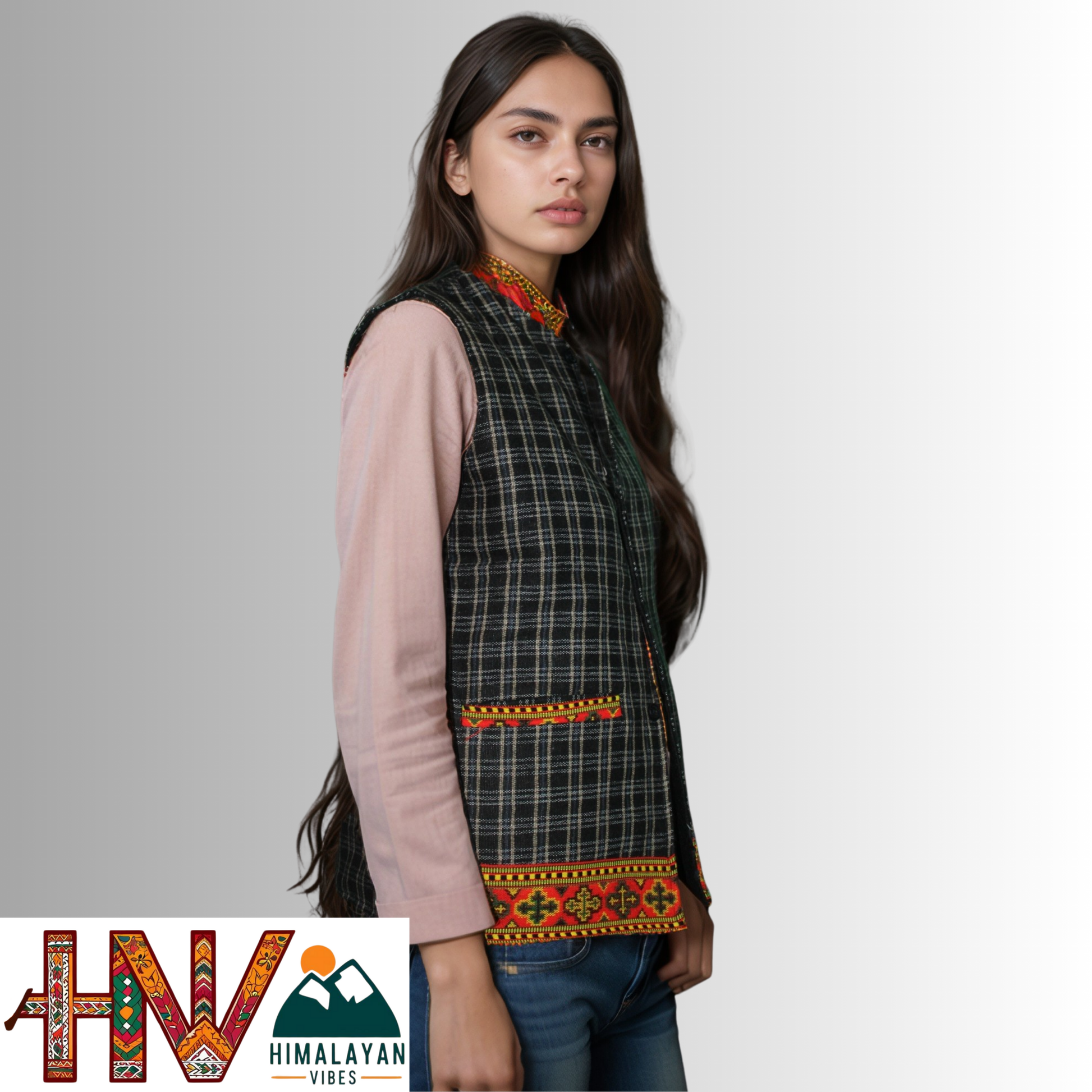 Women's Checked Black Woolen Sadri with Kullu Patti - Elegant Traditional Wear by Himalayan Vibes